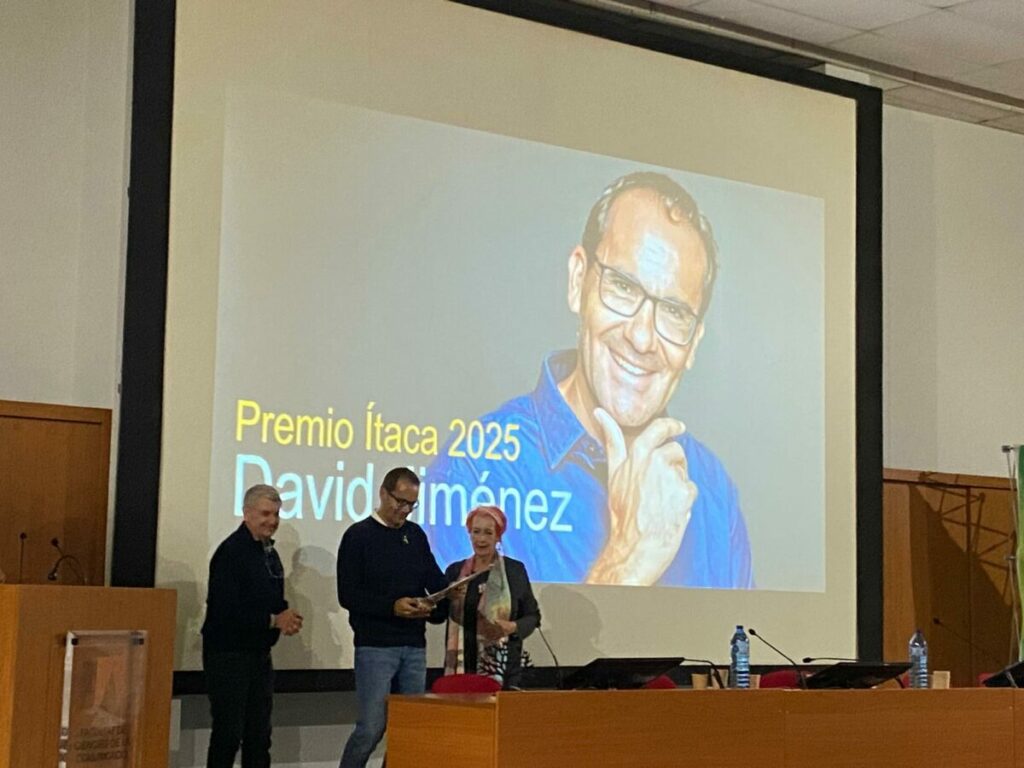 David Jiménez rebent el Premi Ítaca 2025 de mans de Rosa Maria Calaf. Elaboració pròpia.