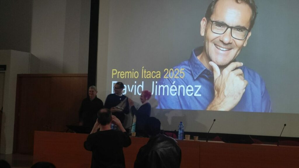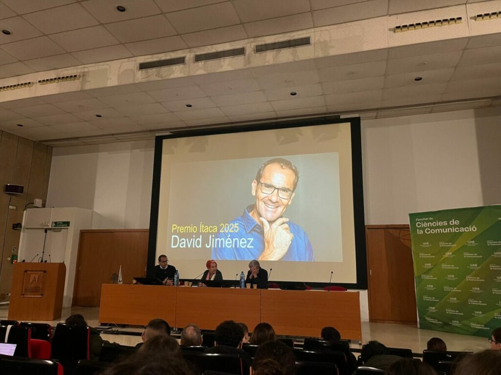 Tot seguit s’ha fet entrega del Premi Ítaca 2025 al periodista i escriptor David Jiménez, reconegut per la seva trajectòria marcada pel compromís amb la independència informativa. La periodista Rosa Maria Calaf li ha lliurat la distinció —una estatueta amb la forma d’un vaixell inspirat en el poema Ítaca de Kavafis— i ha mantingut una conversa amb ell sobre els reptes actuals del periodisme internacional i l’estat en el que es troba el periodisme en general. Rosa Maria Calaf va comentar sobre Jiménez: “El periodismo tiene que ser humilde y este es uno de los valores de David Jiménez”.