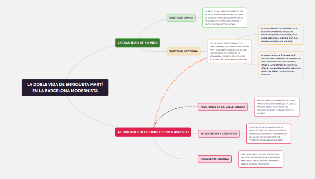 Enriqueta Martí se movía entre dos mundos. Durante el día frecuentaba los barrios más humildes de la ciudad, pero por la noche solía aparecer en ambientes reservados a la alta sociedad. En 1909, fue detenida por dirigir un prostíbulo en la calle Minerva. Aunque fue puesta en libertad poco después, su nombre ya empezaba a circular entre los investigadores y periodistas de la época.