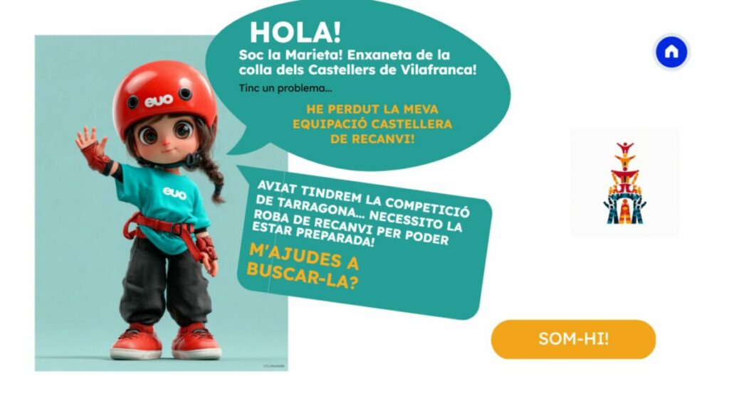El joc s’inicia amb la presentació de la Marieta, la protagonista de la història, que planteja al jugador un conflicte inicial: ha perdut part de la seva roba castellera i necessita ajuda per recuperar-la. A partir d’aquesta problemàtica, el jugador entra en una primera fase informativa on, mitjançant continguts breus i visuals, s’expliquen els conceptes bàsics del món casteller: l’estructura dels castells, el significat simbòlic de la tradició i la seva evolució històrica.